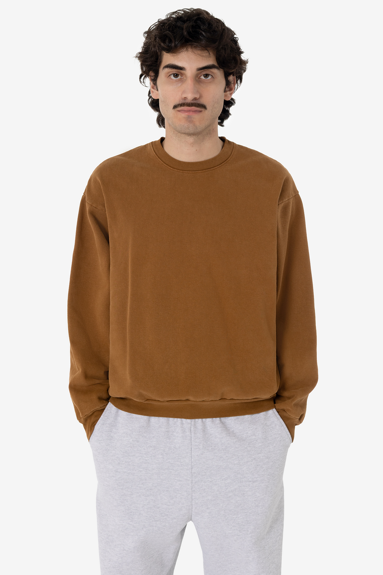 Our garment-dyed crewneck sweatshirts are dyed after they're sewn, which gives them a more durable and even color, including in the stitching and ribbing. This also means they'll have less shrinkage and colors will stay true after repeated washings.